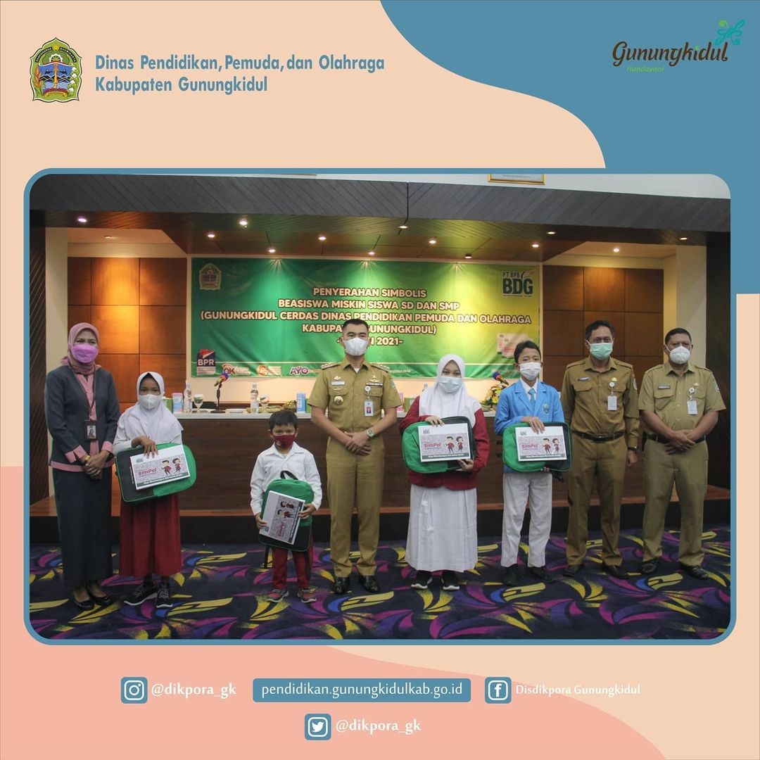 WONOSARI- Drs. Sudya Marsita, M.M. selaku Pelaksana Tugas (PLT) Kepala Dinas Pendidikan, Pemuda, dan Olahraga (Disdikpora) Kabupaten Gunungkidul mendampingi H. Sunaryanta Bupati Gunungkidul dalam kegiatan Penyerahan Secara Simbolis Beasiswa Miskin Siswa SD dan SMP (Gunungkidul Cerdas Dinas Pendidikan, Pemuda, dan Olahraga Kabupaten Gunungkidul). Batuan Beasiswa Ini bertujuan untuk meringankan beban orang tua dalam menghadapi pandemi COVID-19 dan meningkatkan minat pendidikan serta kesejahteraan masyarakat. Kegaitan penyerahan beasiswa secara simbolis diikuti oleh perwakilan siwa dan guru dari jenjang SD dan SMP.